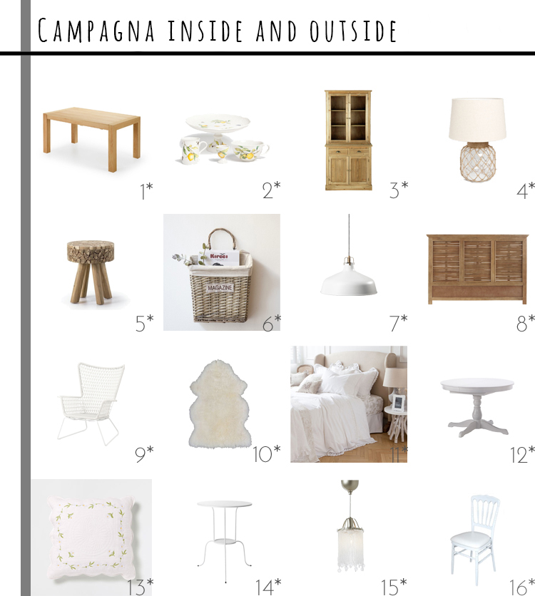 From the moment I found out I was pregnant I went to live in the countryside, outside Milan, where everything is less hectic and especially where I was sure to find valuable help to bring up my baby. We were and we found a classic country house, with a large garden, a tool shed that looks like the home of Snow White, large spaces and large windows that open onto a terrace. In short, the best start to our life to threesome! Our home furnishings are still to be completed, the house still lacks a thousand details that will make it unique and personal. Meanwhile my eyes shine with whatever I find on the web and I try to make a shopping list…what do you think of these choices? Here I’ve made my usual selection of items that could go well together with this style of furniture. The place looks warm and especially not contaminated by fads to me. Now I leave it on the table for your considerations.