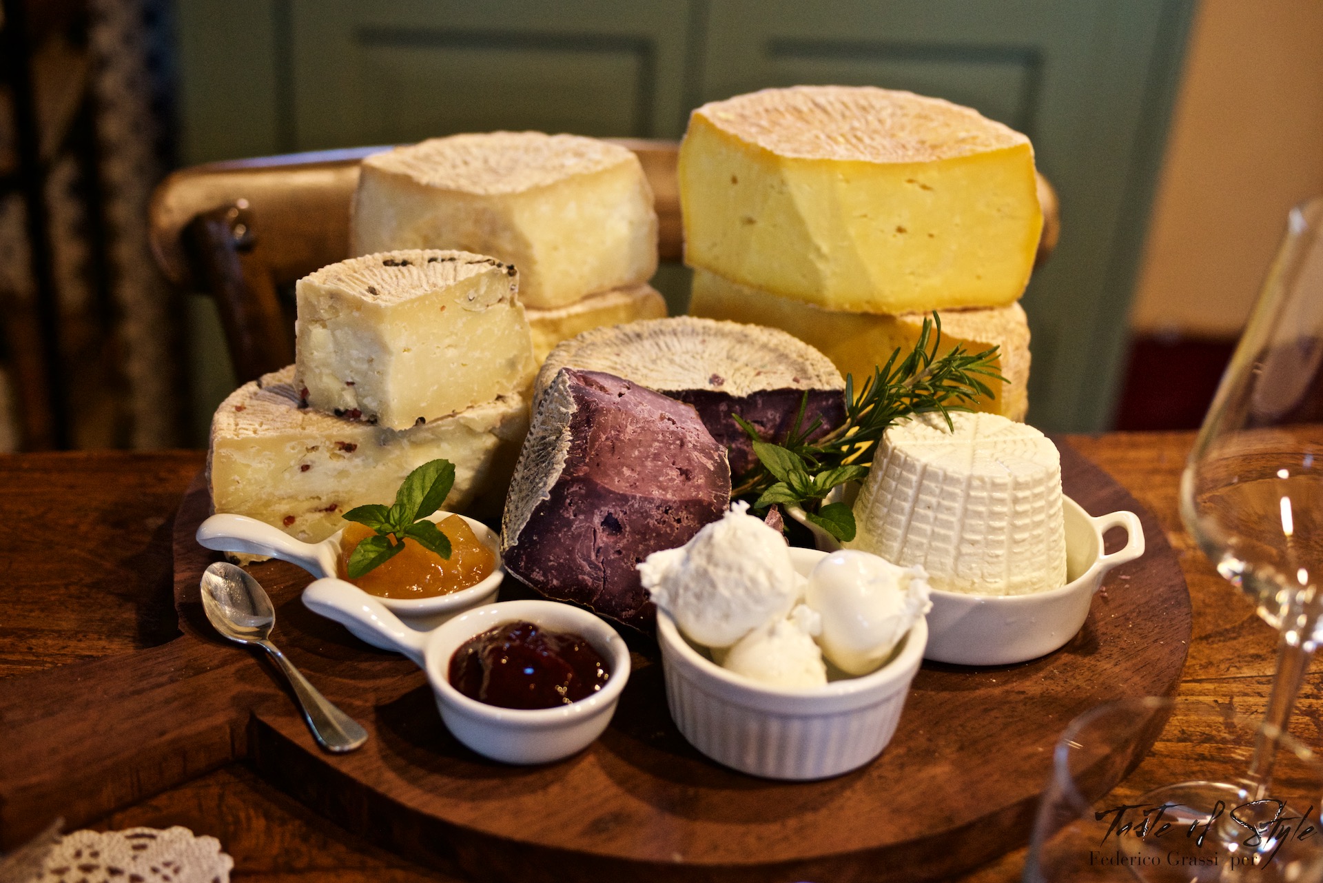 Iniziamo con un tagliere di formaggi, prodotti tutti in loco e in vendita nella bottega adiacente al ristorante: toma al peperoncino, cacioricotta, toma allo zafferano e pepe in grani, crescenza stagionata, salamino di coscia e dulcis in fundo marmellata di melone cannella e peperoncino.